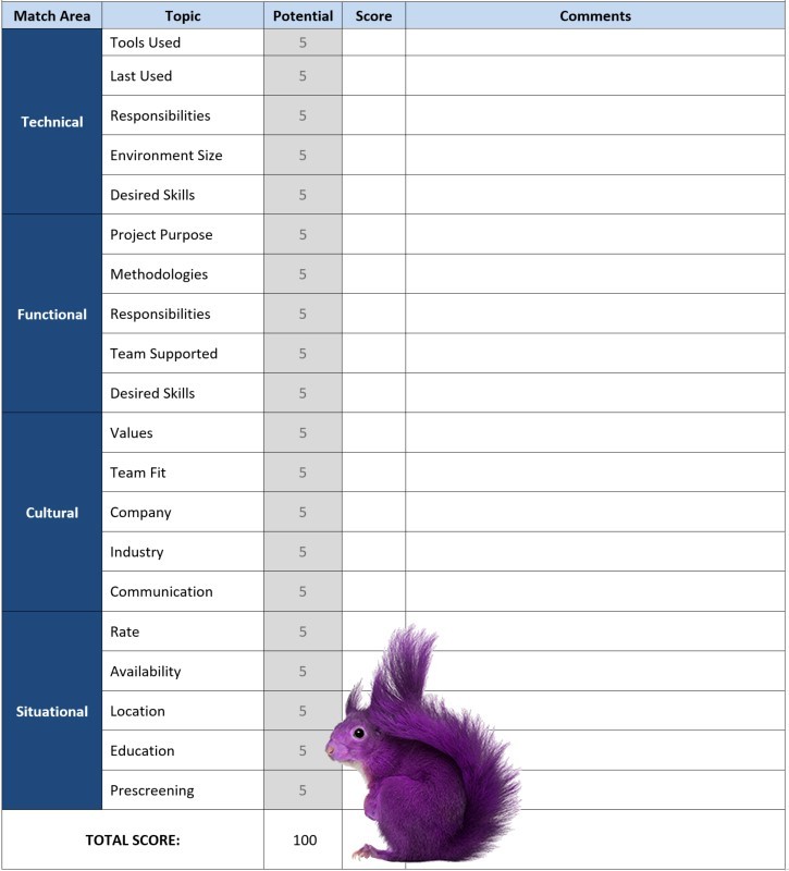 I needed facts. I needed to try and quantify a whole lot of intangibles. I created a scorecard and started breaking down the things my clients were seeking in their “perfect” candidate into four match categories: Technical, Functional, Cultural, Situational.