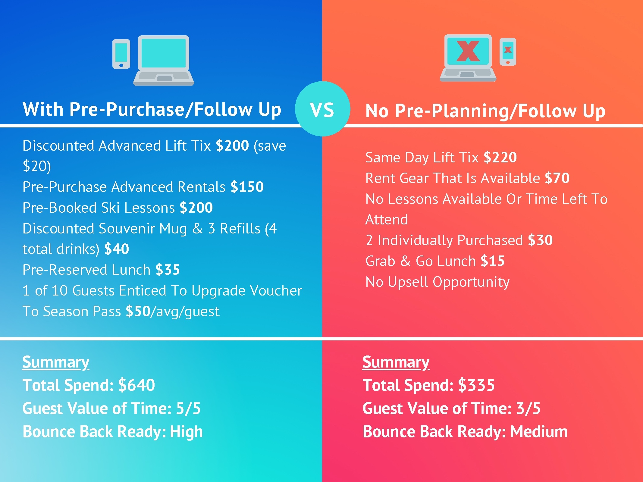 When comparing guest spend when they pre-purchase versus when they purchase at the ticket counter on-site, guests who pre-purchase tend to spend more, have the opportunity to experience a greater number of activities during their visit, and are more eager to return.